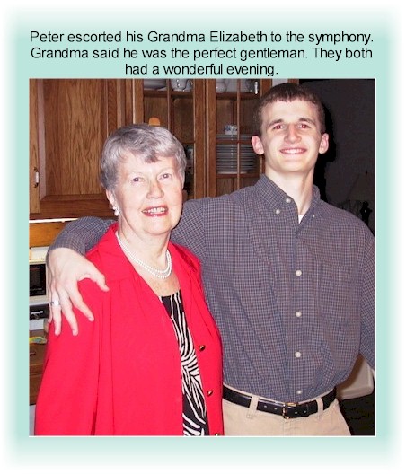 Peter was invited to join Grandma Elizabeth for an evening at the Indianapolis Symphony Orchestra. It was his first chance to learn some polite-society etiquette, and Grandma said he was "just charming!" | |