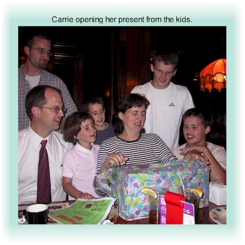 Carrie turned 47 on June 10th (the "older woman" for three days). The kids blindfolded her and took her to her favorite restaurant for a birthday party, complete with a bouquet! |