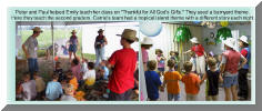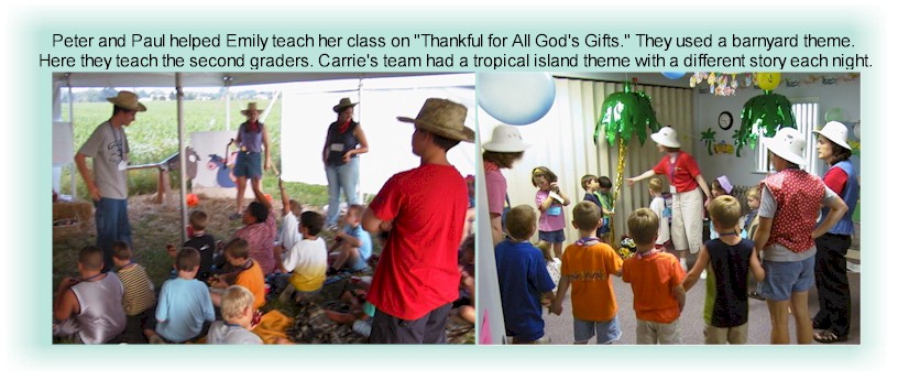 VBS was exciting and rewarding once again! A bit of a rainy/muddy challenge, especially with construction of our new worship center underway. I was thrilled to see all of our kids (Andy, Em, Luke, Peter, and Paul) taking a strong role in teaching/performing. Andy was a nefarious pirate in the nightly skit. Peter and Paul sang the "A Thankful Heart" song from Veggie Tales to their classes each night! |