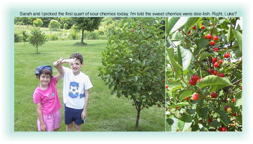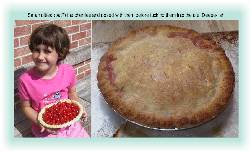 My dear siblings pitched in and bought us 3 cherry trees for our 25th wedding anniversary. And with our 27th just 3 weeks away, we're already harvesting our first batch of cherries! Thanks, Bros and Sis! Right: Sarah with our first home-grown cherry pie. |