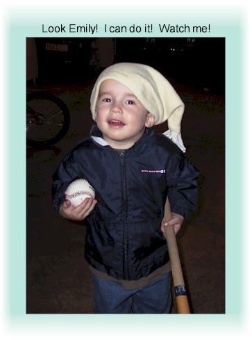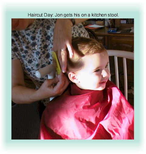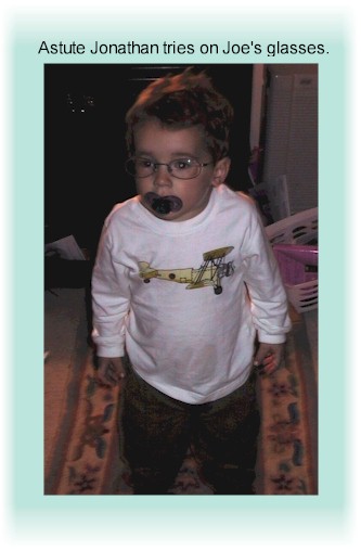 More Jono pix. Upper right: Jonathan was third in line on haircut day, behind Paul and Mark. There were "Big Boy!"s all around. Left: trying his hand at baseball, and (right) at glasses. |