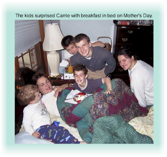 Emily arrived home from college just in time to help the other children put together a scrumptuous breakfast-in-bed for Mother's Day. Speaking of mothers, our bathroom window was quite the classroom this past 3 weeks! |