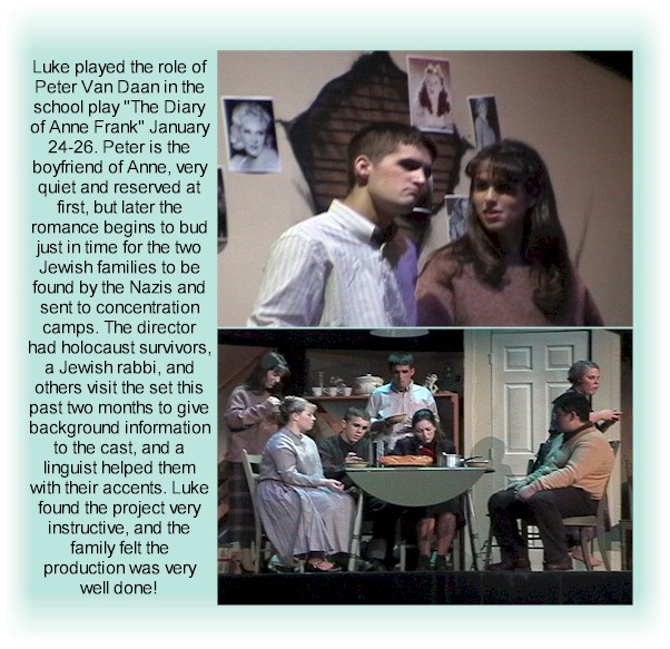 This past two months Luke has worked hard preparing for Greenfield Central High's school play, "Diary of Anne Frank." We attended the second of four performances Thursday evening January 24, and found the performance to be outstanding for a high school production. This is Luke's third acting experience. Unfortunately, they didn't allow any video recording of the play! |