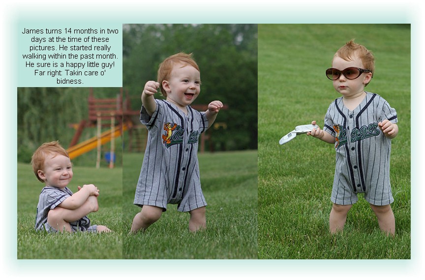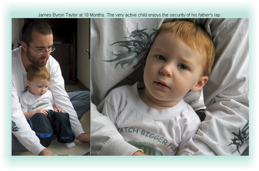 James is expecting to have a younger brother within a few weeks! He loves cars and lining things up. He loves to sing. His mother says he's the cutest Taylor ever. His vocabulary is expanding rapidly and now includes the very important words "Mimi" and "Poppaw." |