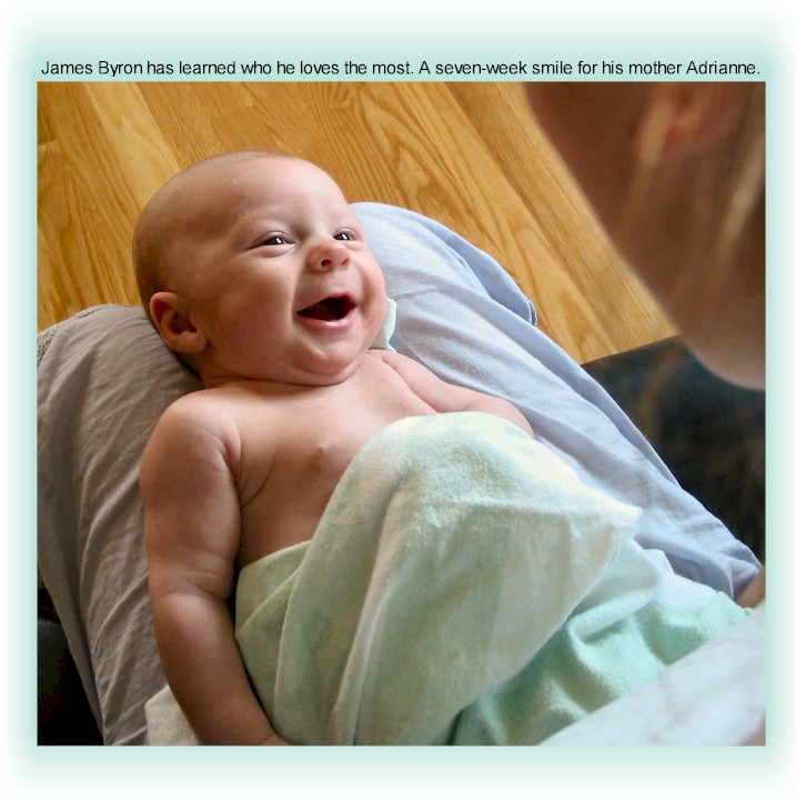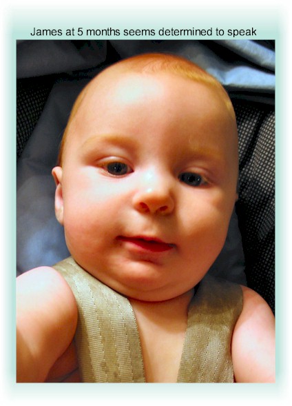 It has been a heart-warming experience to see two inexperienced parents develop literally overnight into caring, loving and very capable parents! James is responding with his own happy personality. |