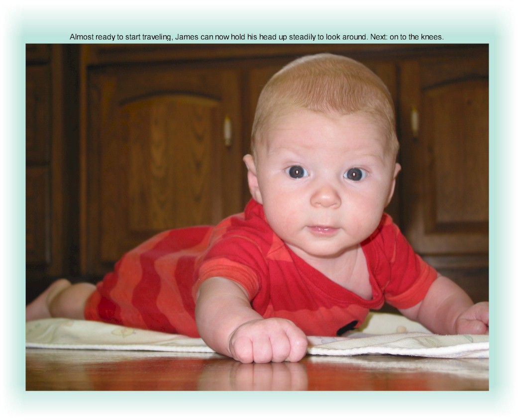 James loves to study faces. He holds his head up, whether lying down or sitting up. He has strong legs, and can stand up if you hold his hands. |