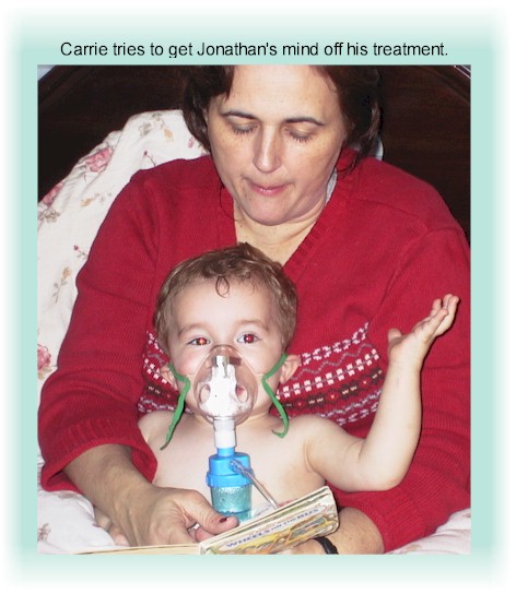 We're still struggling with Jonathan's frequent respiratory infections, or whatever they are. Carrie's had to become creative in ways to distract Jonathan so he'll keep the mask on his face for an aerosol treatment. (He hates it.) |