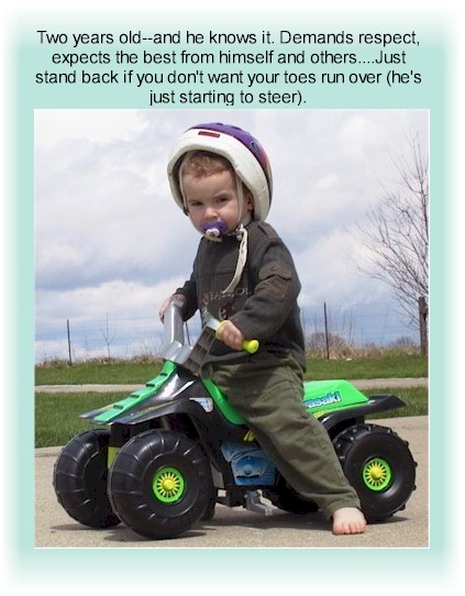 Jonathan's second birthday finds Mom wondering how much longer she will have the energy to pick up after this guy! Nothing is out of his reach by now. This picture captures the "attitude". Carrie found this electric four-wheeler at a consignment store for cheap, and Jon has absolutely loved it. |