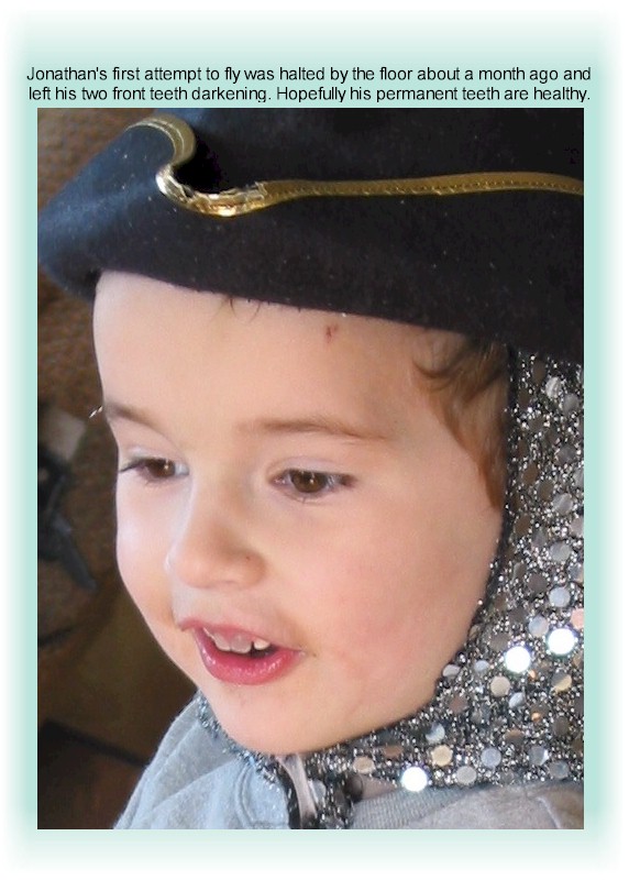 Jonathan is so full of wonderful, fascinating imagination! Recently he did Superman from the back of a large armchair to test his flying ability. Gravity put an end to his test-flight, and the hardwood floor smashed his two front teeth. |