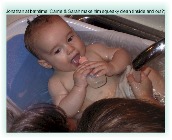 Sarah and Carrie give the baby a bath in the kitchen sink. Jonathan at seven months has come to enjoy bathtime. Actually, I'm not sure who enjoys it more, Jonathan or Sarah. |