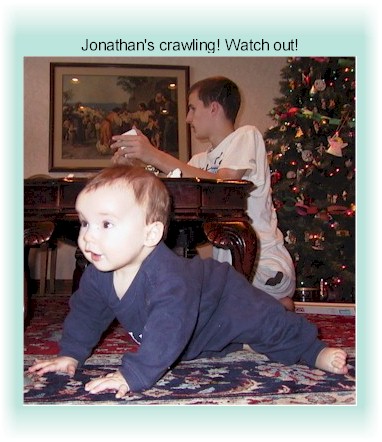 He's standing and just starting to take a couple of tentative steps while holding on. He pulls down everything within reach. (Just now pulled over Mom's mop-bucket. His eyes said, "coool!") He's excited about everyone and everything. On January 31, he said his first bona fide word: "keety!" He does love the cat, who doesn't return Jonathan's affections. |