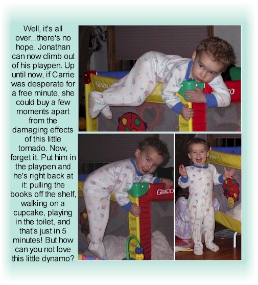 I don't want you to get the idea that Jonathan is less active because he's been sick. In fact, this little guy can do the damage of any ten grown men. And it just got worse: Jono can now climb out of his playpen! He's so proud... |