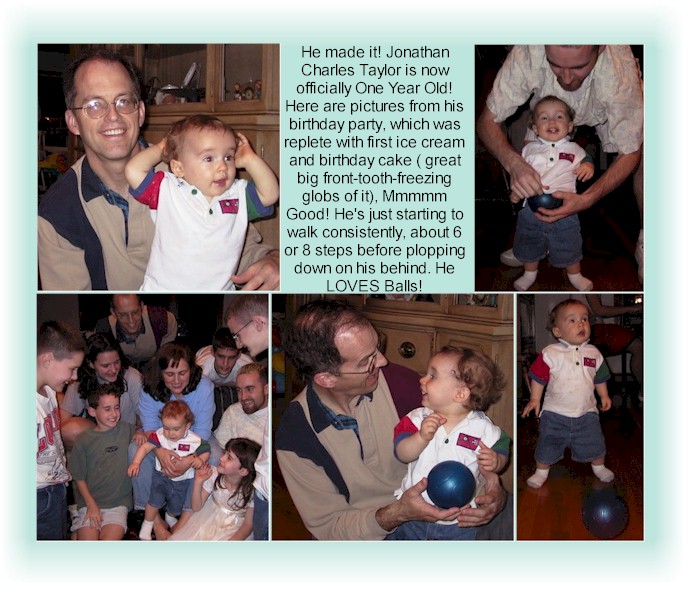 Well by the Grace of God, Jonathan reached his first birthday alive. He's beginning to walk, but still prefers to crawl. He can empty the contents of the kitchen cupboards in less than 90 seconds, 80 seconds in bare feet. Here are pictures from his one year birthday party on April 12, 2001. |