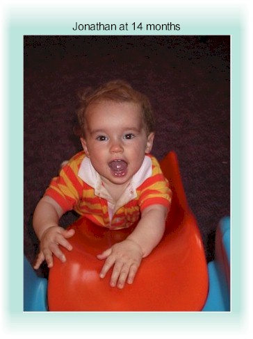 Jonathan is already all boy. We're talking wild-man. Here he's flying down his plastic slide without care for life or limb. He's actually been in poor health the past 4 months, with almost continuous ear infections. He's due to have tubes placed soon. But he's growing like a weed. What a chunk! |