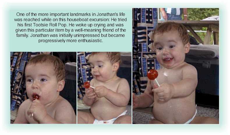 While on our houseboat vacation this month, Jonathan made one of life's great discoveries: Tootsie Roll Pops. His facial expressions as he comes of age are priceless. He's just beginning to make some intelligible sounds. For instance, we can just make out "please" and of course "Daddy". |