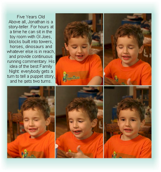 Jonathan has experienced dramatic growth intellectually this year. We have been amazed particularly at his mathematical ability, but his understanding of spiritual and philosophical concepts is also delightful. He enjoys doing everything the older boys are doing, yet there's no doubt he's Momma's boy. |