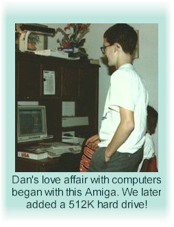 | Our first computer was an Amiga. Dan was enthralled with it from the first day. We later upgraded by adding a hard drive with a whopping 512K! This was the beginning of a (so far) lasting love affair with computers. |