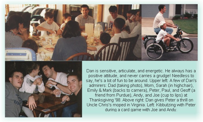 Dan is known for his easy-going, genuine, unconditional friendship, and his fun-loving spirit. Among his many admirers are his parents and nine siblings. |