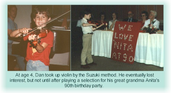 Dan took on Suzuki violin lessons for a while, but with the (overzealous) help of his father, that soon bit the dust. He was really quite good! Here he plays for his greatgrandma Anita at her 90th birthday party | |